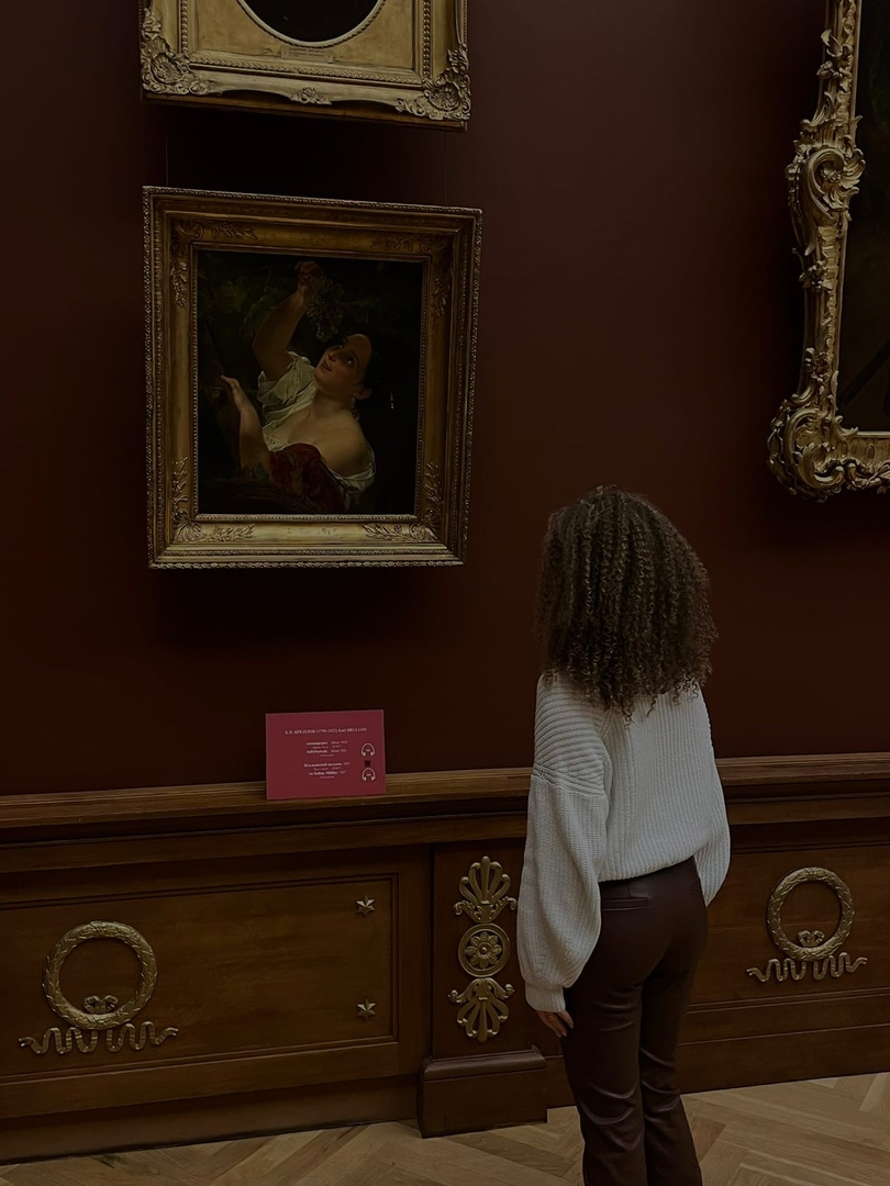 Брюллов написал картину в романтическом стиле, который был популярен в те времена. Не зря считается, что вначале 19 века творчество русских мастеров сочетает в себе элементы двух направлений сентиментализма и романтизма, основными задачи которых является выражение чувственности, любви к природе и человеческой красоте, отсутсвие негативных аспектов. Так и картина "Итальянский полдень" выражает полное умиротворение, передает всю нежность девушки через ее аккуратные прикосновения к кистям винограда, а взгляд барышни позволяет передать художнику всю любовь к увиденному, к природе, которая окружает девушку на картине со всех сторон. Смотря на картину, мы не ощущаем ни капли тревожности, а наоборот наполняемся легкостью и искренностью, как и улыбка молодой южанки.